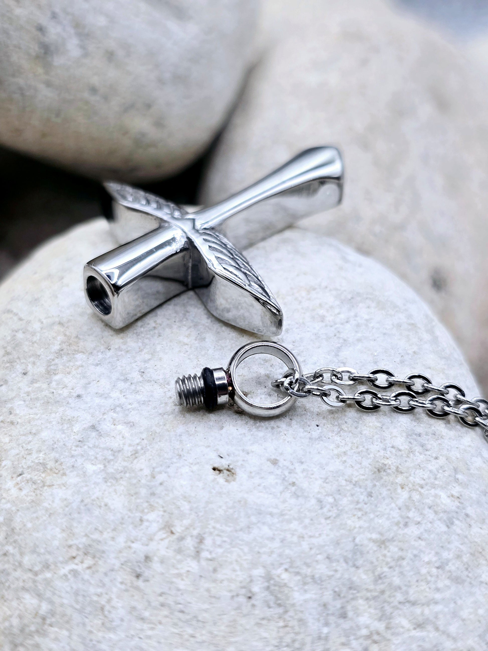 Crafted from durable stainless steel, this angel wing cross pendant and chain offers a timeless symbol of faith and remembrance. Designed for both men and women, it includes a convenient tool set to securely insert ashes, allowing you to carry a cherished memory close to your heart. Elegant and meaningful, this pendant is a perfect way to honor and celebrate your loved ones every day.